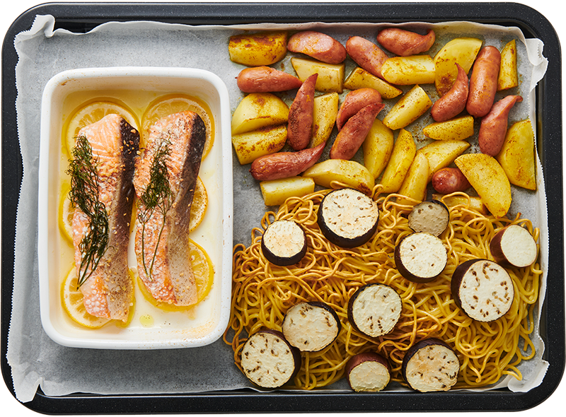 サーモンのレモン焼き&焼きそばめんミートソース&スパイシージャーマンポテト