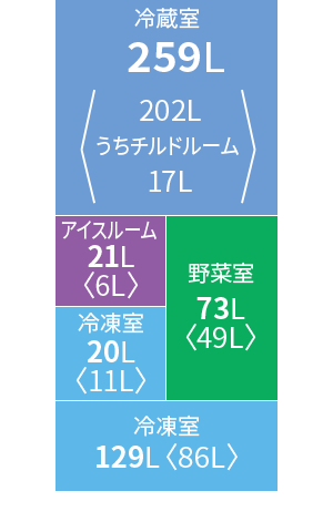 - ※1● 定格内容積は、日本産業規格(JIS C 9801-3:2015)に基づき、庫内の温度制御に必要でない庫内部品(棚やケース等)を外した状態で算出したものです。 ● 〈 〉は「食品収納スペース」の目安です。