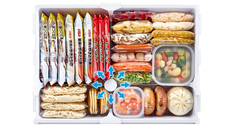 冷凍ケースを自由に仕切って、キチンと整理できる4切り(しきり)名人。タテ収納で収納量がアップし、使い忘れを防ぎます。