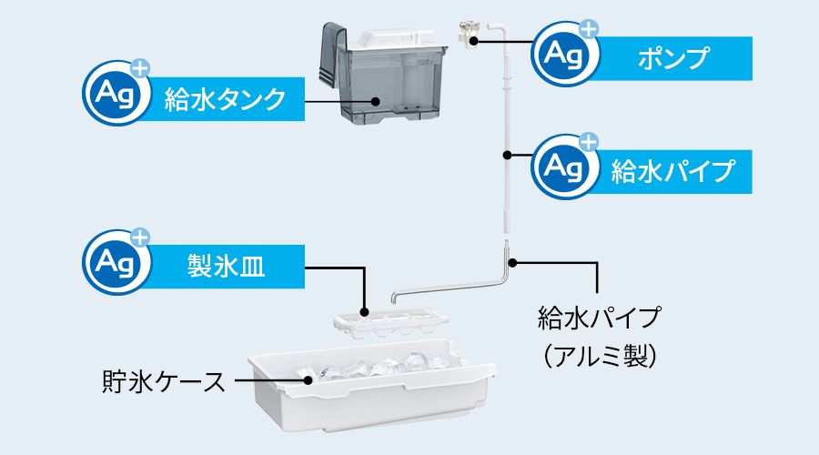 ボタンを押すだけで、製氷皿・給水パイプをラクラク水洗い。わざわざ取り外して洗う手間がいりません。また、給水タンク・ポンプ・製氷皿はAg⁺イオン加工で抗菌※5され、清潔に保たれます。