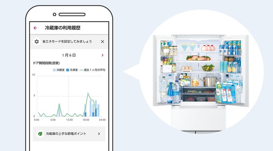 ドアの開閉をグラフで確認できます。節電サポートに役立ちます。