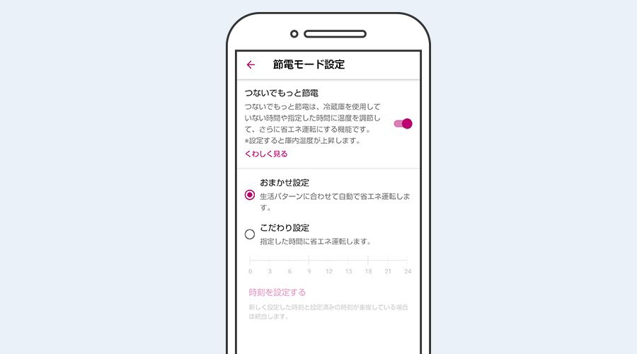【おまかせ設定】ドア開閉履歴から生活パターンを学習。省エネタイミングは冷蔵庫におまかせ。 【こだわり設定】省エネ運転を行う時間を指定できます。深夜プランや節電プログラムに参加の方におすすめです。