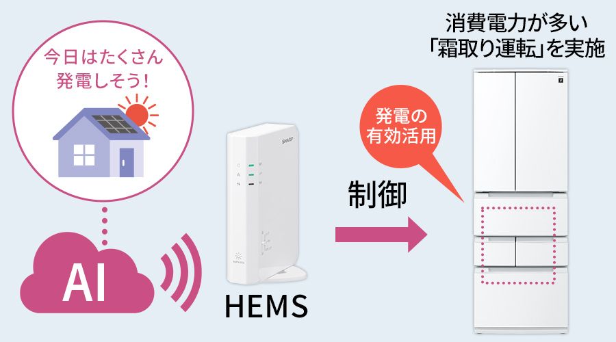 AIが予測した余剰電力量に応じて冷蔵庫の霜取り運転を最適化。太陽光発電の電力を効率よく活用して冷蔵庫を運転することで電力のムダを抑えます。※9