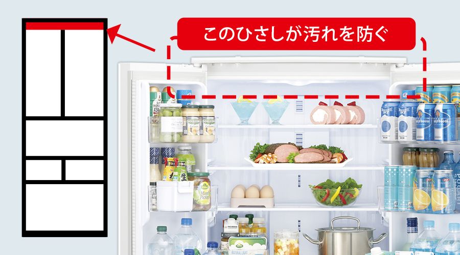冷蔵室上部のひさしが、キッチンに舞うホコリや油汚れからパッキンを守ります。
