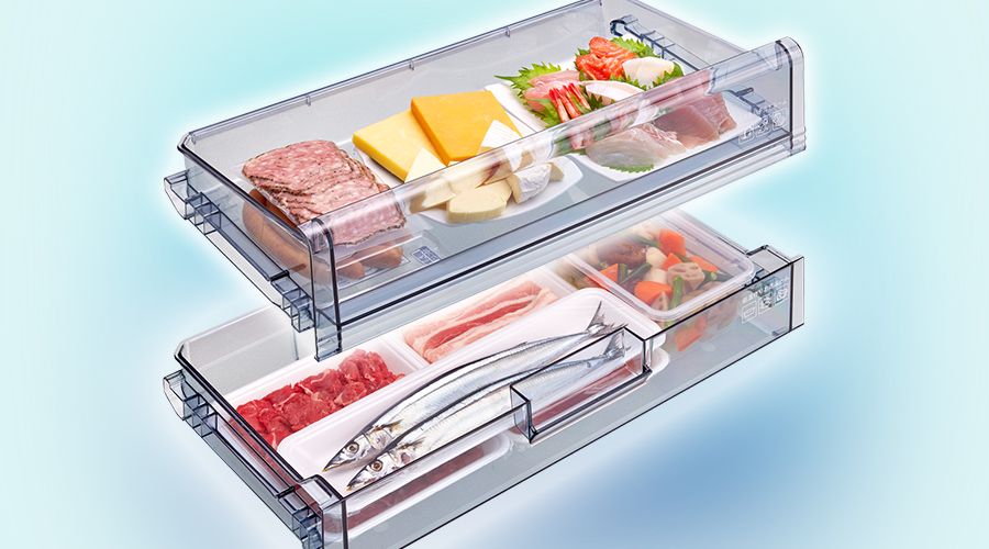 お刺し身やハム・チーズなどの乾燥にデリケートな食材は上段の「うるおいチルド」で、肉・魚などの生鮮食品や惣菜は、下段の「低温作りおきルーム」で鮮度をキープ。