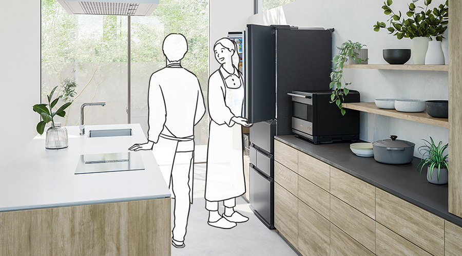 奥行き薄型だから冷蔵庫が出っ張らず美しいキッチンに。作業スペースにも余裕が生まれ、キッチンに2人で立った時もじゃまにならず、快適に作業ができます。