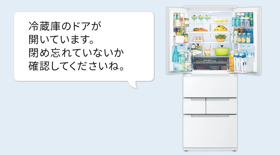 ドアを閉め忘れた時も、アラート音に加え、音声でもお知らせ。閉め忘れを手厚くサポートすることで、電気のムダ使いを抑えます。
