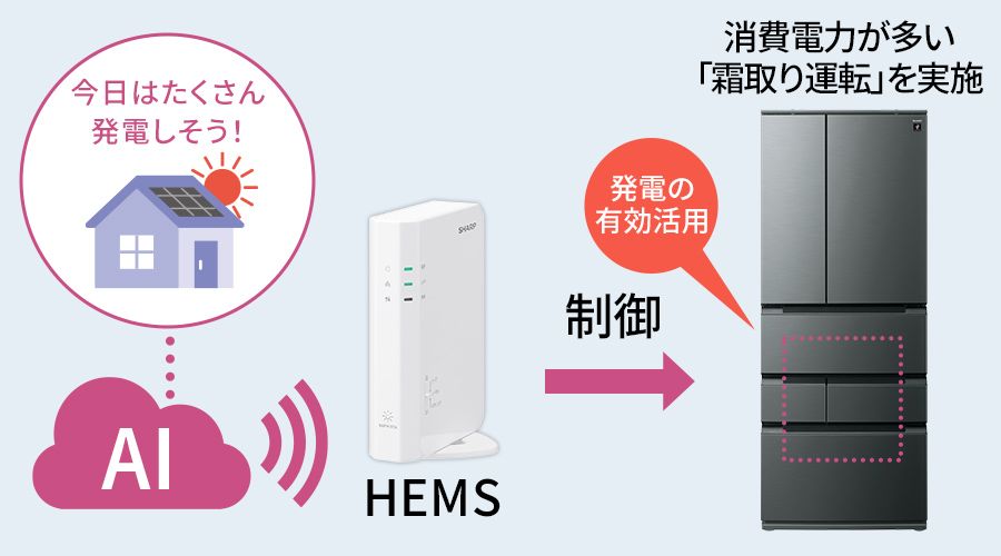 AIが予測した余剰電力量に応じて、冷蔵庫の霜取り運転を最適化。太陽光発電の電力を効率よく活用しながら、冷蔵庫を運転※3することで、電力のムダを抑えます。