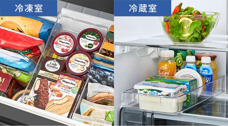冷凍室に設置してあるフレキシブルトレーは、冷蔵室でも使えます。生活スタイルにあわせて小物をすっきり収納できます。