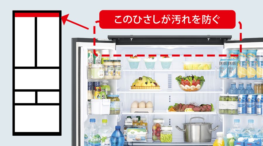 冷蔵室上部のひさしが、キッチンに舞うホコリや油汚れからパッキンを守ります。