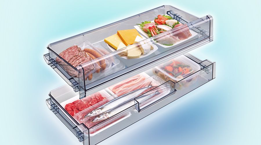 お刺し身やハム・チーズなどの乾燥にデリケートな食材は上段の「うるおいチルド」で、肉・魚などの生鮮食品や惣菜は、下段の「低温作りおきルーム」で鮮度をキープ。