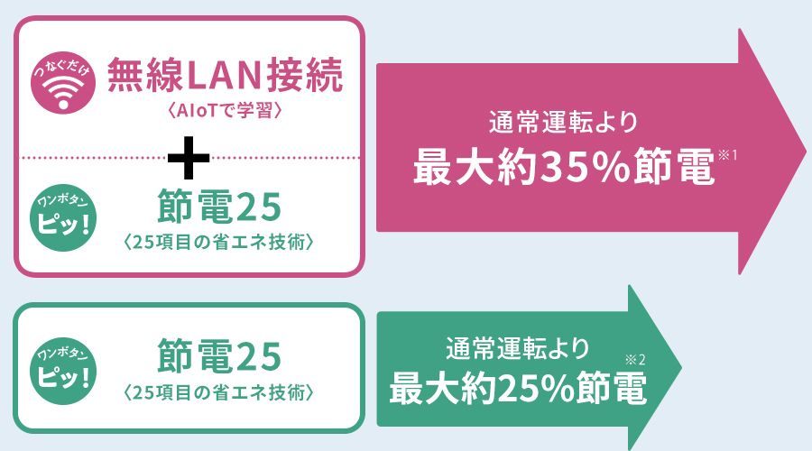 冷蔵庫本体の最大約25%※2節電に加え、無線LAN 接続を組み合わせることで通常運転より最大約35%※1節電が可能に。冷蔵庫の使用状況を学習し自動的に判断、各ご家庭の生活パターンから賢く省エネ運転をします。