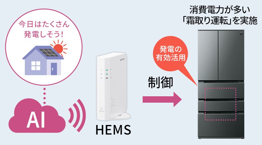 AIが予測した余剰電力量に応じて、冷蔵庫の霜取り運転を最適化。太陽光発電の電力を効率よく活用しながら、冷蔵庫を運転※3することで、電力のムダを抑えます。