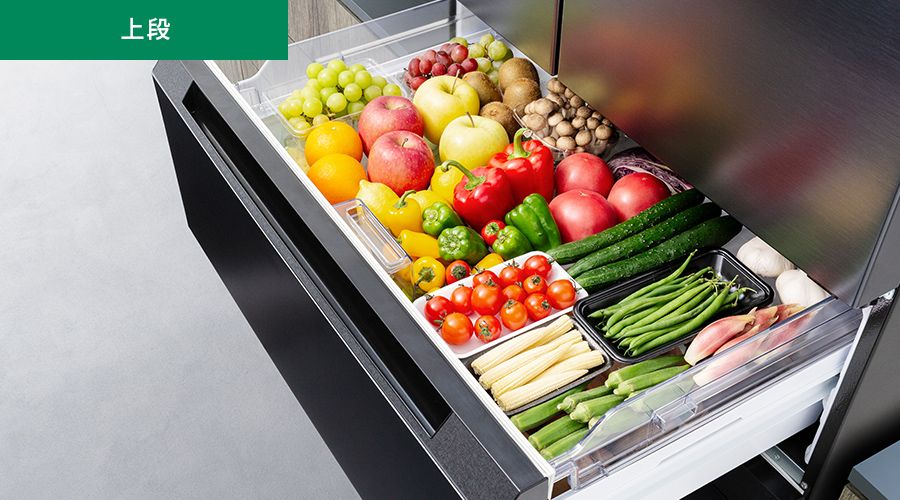 上段と下段の深さの違うケースで、野菜や果物の大きさや種類に合わせて、便利に区分け収納できます。