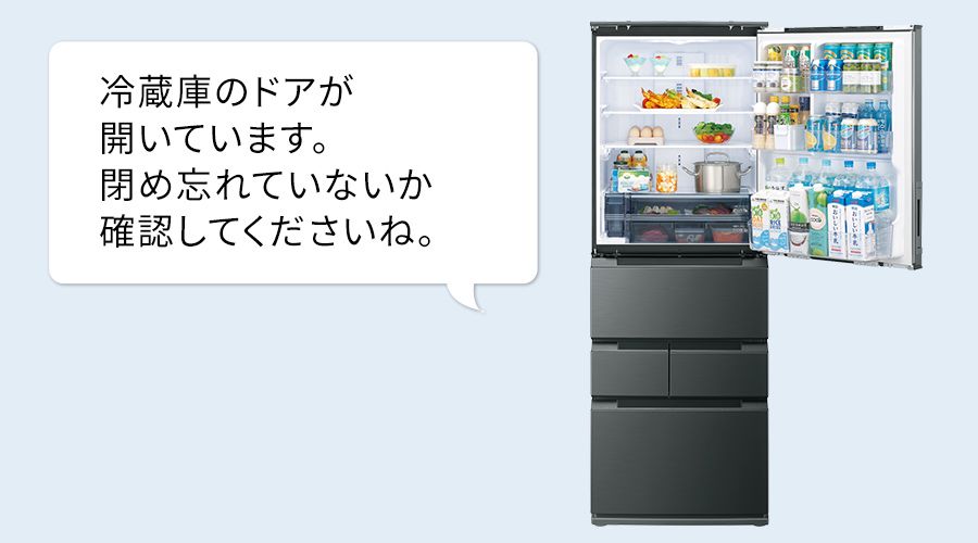 ドアを閉め忘れた時も、アラート音に加え、音声でもお知らせ。閉め忘れを手厚くサポートすることで、電気のムダ使いを抑えます。