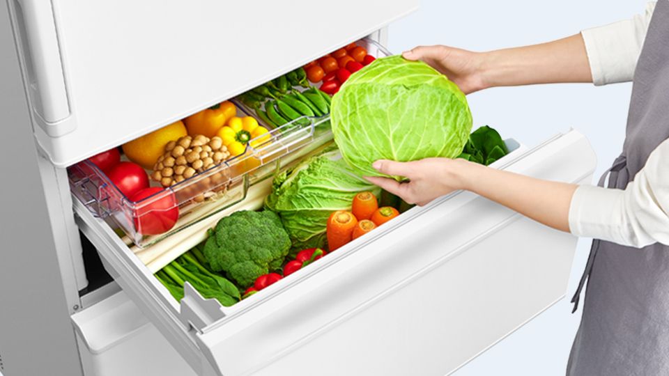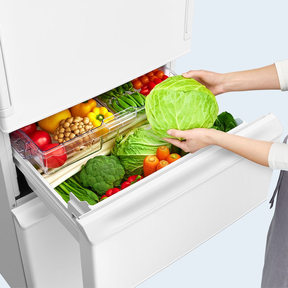 オートクローズどっちもドア、真ん中レイアウトシャキット野菜室、キッチンにスッキリ設置できる奥行き薄型65cm