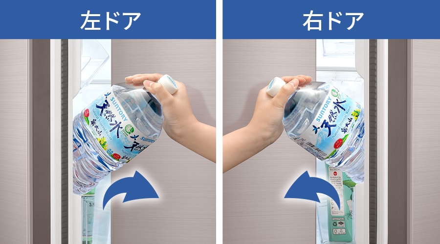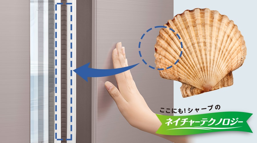 センターピラーとは、左右のドアの隙間を埋める柱。センターピラーがあるとドアポケットの収納スペースが狭くなりますが、シャープのフレンチドアは全てセンターピラーがない独自構造なので、ドアポケットも広々使えます。ドアの開け閉めも持つ場所を選ばないのでラクラク。