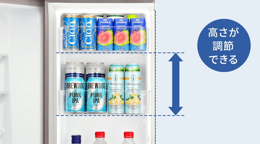 ビンやボトルの高さに合わせて、ドアポケットの高さを調節できます。