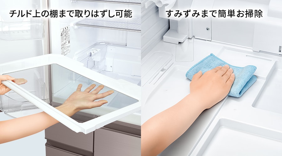 チルド上の棚まで全て取りはずしができるので、今まで掃除ができなかったところまで簡単にお掃除可能に。