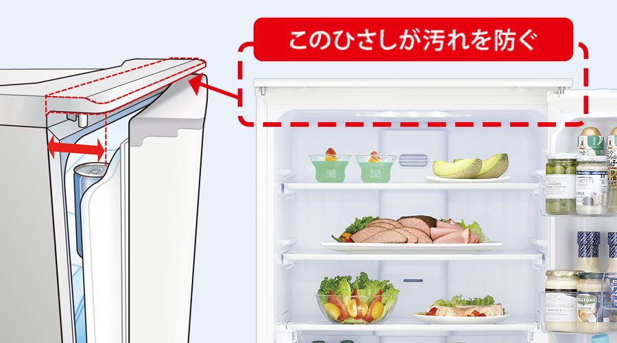 冷蔵室の上のひさしが、ホコリや油煙によるパッキンの汚れを防ぎます。