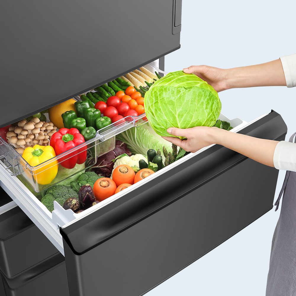 オートクローズどっちもドア、真ん中レイアウトシャキット野菜室、大小切替氷製氷