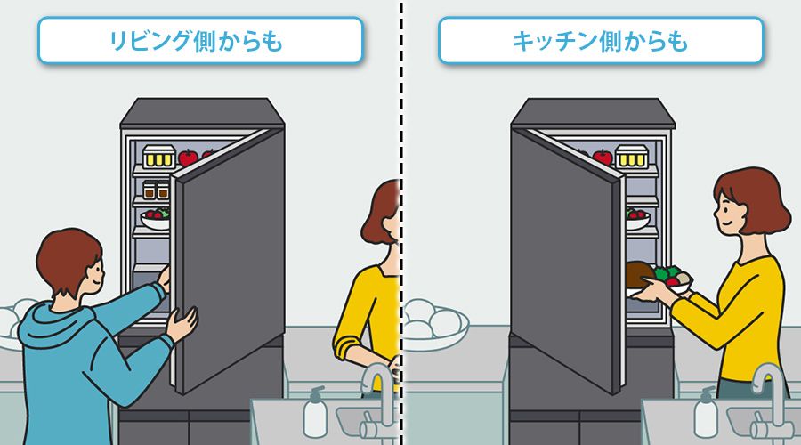 例えばキッチンから⾷材を、リビング‧ダイニングから飲み物を取り出す時、回り込むことなく近い⽅からサッと開閉。その時の⽴ち位置や動線により、左右どちらからでも⾷品を出し⼊れできます。