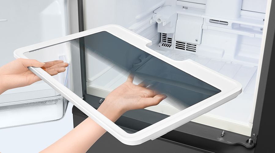 インテリアになじむやさしい質感。大きなラウンド形状のどっちもドアハンドル。ラウンディッシュシェルフやチルド棚の天板まで取りはずしができ、お手入れがラクに隅々までできます。