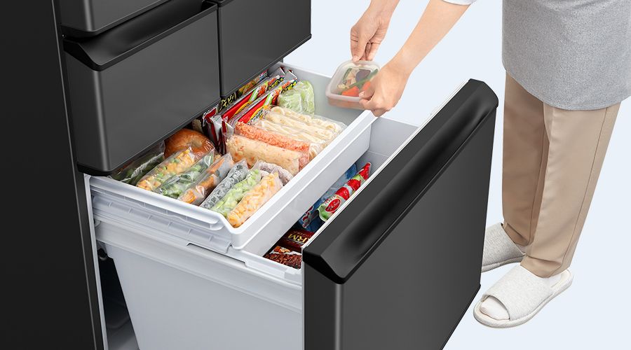 大容量3段冷凍室を採用。買物カゴ約2.3個分*(33L/個)がたっぷり入る大容量でまとめ買いも余裕で対応できます。