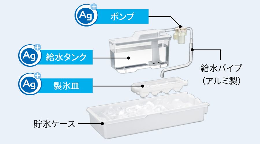 ボタンを押すだけで、製氷皿・給水パイプをラクラク水洗い。わざわざ取り外して洗う手間がいりません。また、給水タンク・ポンプ・製氷皿はAg⁺イオン加工で抗菌※3され、清潔に保たれます。