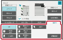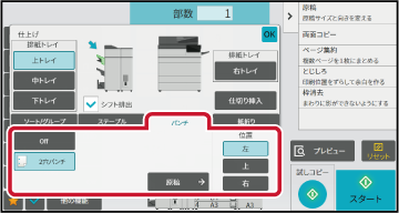 ソート/グループ/オフセット/仕切り挿入/ステープル/パンチ機能/紙折りなどを使い、コピーする用紙の仕上がりを設定します。また、コピーされた用紙の排紙先を設定します。