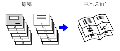 中とじ用紙の1ページ内に2枚の原稿または、4枚の原稿を均等に割り付けてコピーします。