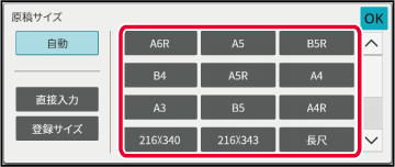 定型サイズ以外の原稿(インチ系のサイズや不定形サイズの原稿)をセットしたときや、原稿サイズが正しく検知されなかったときは、手動で原稿サイズを指定します。