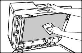 原稿自動送り装置を開き、ガラスクリーナーを取り出す