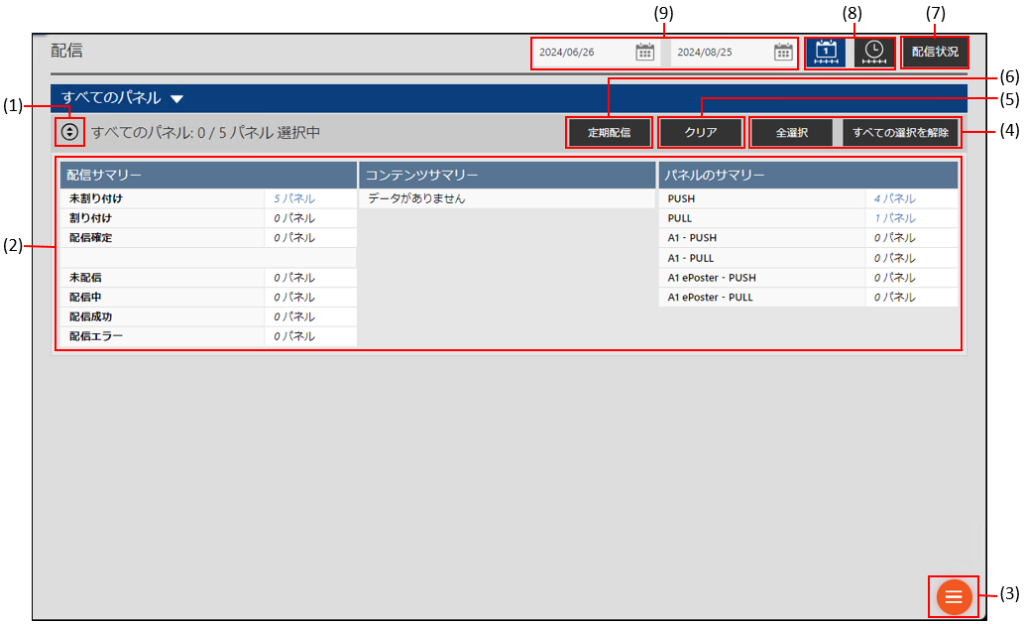 サマリー表示画面では、配信状況(配信サマリー)の他、コンテンツやパネルの情報を表示します。パネル数をクリックすると、該当するパネルのみを絞り込んだパネル表示画面が表示されます。