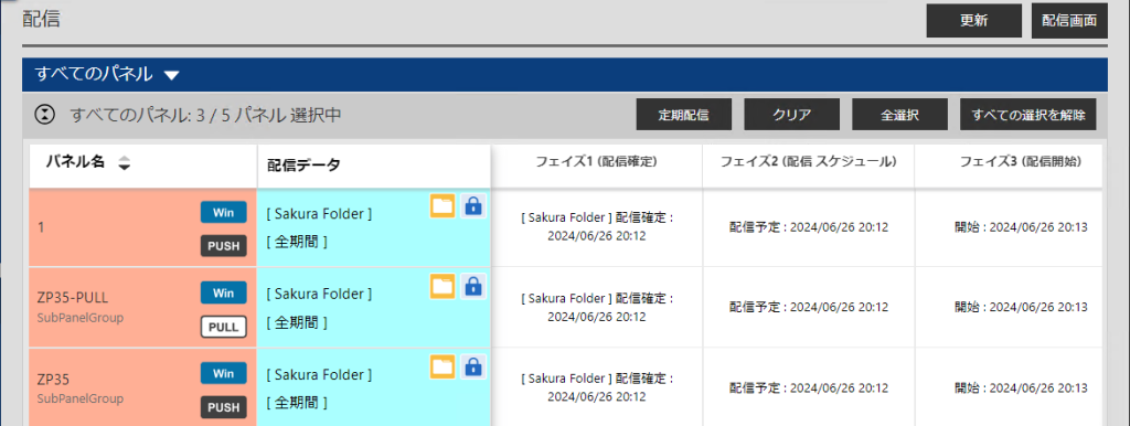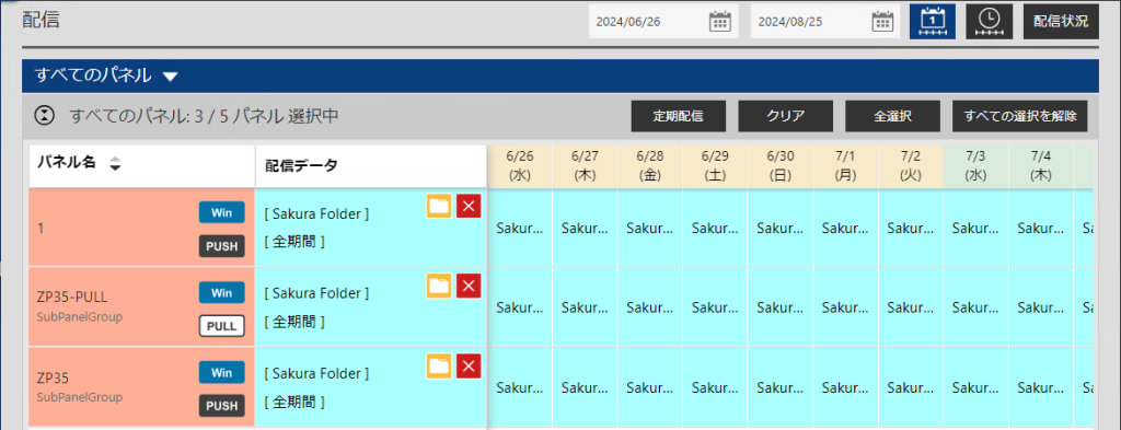 パネルごとに今すぐ/ 日時指定配信、パネルグループごとに定期配信することができます。