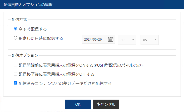 | 配信済みコンテンツとの差 分データだけを配信する | 未配信コンテンツ(ファイル名、ファイル作成日時、データサイズ等が異なるデータ)のみを配信し、配信済コンテンツは配信しません。 |