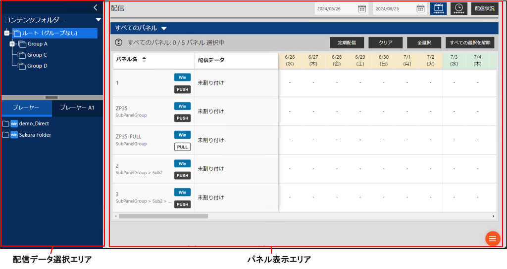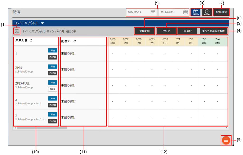 配信データをパネルに割り付けて配信したり、配信を予約したりします。