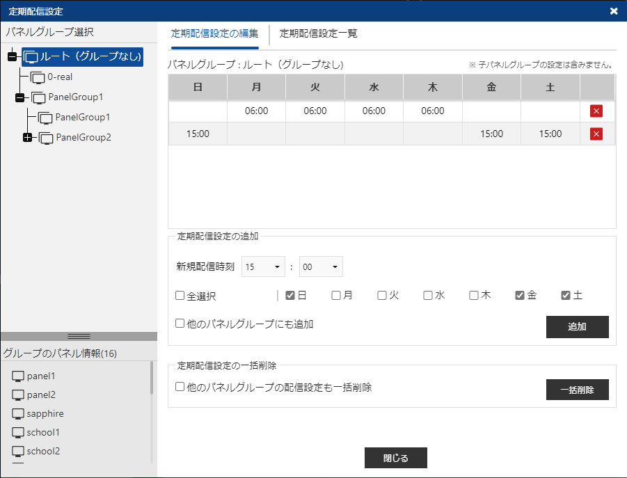 定期配信設定画面の左エリアで、設定を追加したいパネルグループを選択すると、設定が右上のエリアに表示されます。新規配信時刻と曜日を設定して[追加]をクリックすると、設定を追加できます。