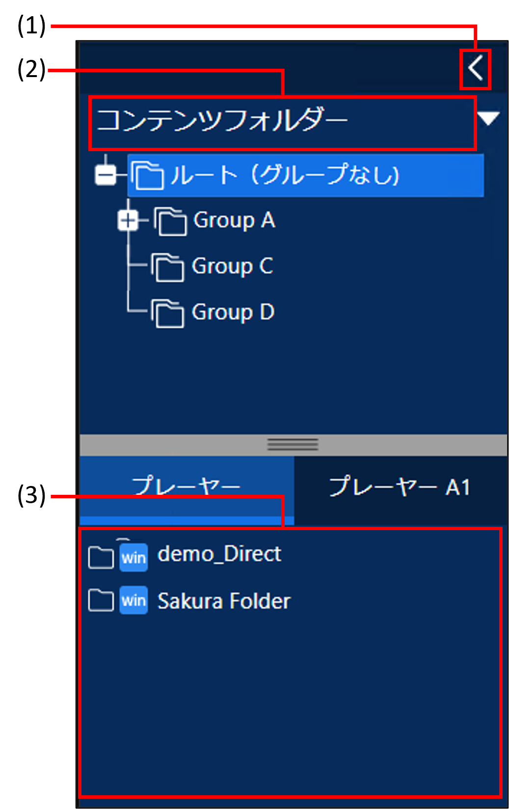 (例 : コンテンツフォルダーが選択されている場合には コンテンツフォルダーグループが表示されます。番組が選択されている場合には 番組グループが表示されます。)