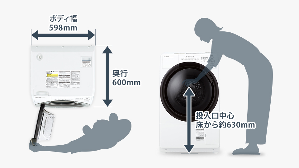 ボディ幅598mmのスリムでコンパクトなドラム式洗濯乾燥機。一人暮らしにもおすすめです。