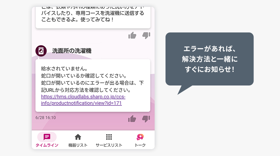 蛇口の開け忘れなどのうっかりミスも、すぐにお知らせ。エラー時やお手入れ時期をお知らせする際には、解決方法やお手入れ方法と合わせてCOCORO HOMEアプリのタイムラインにアドバイスが届きます。