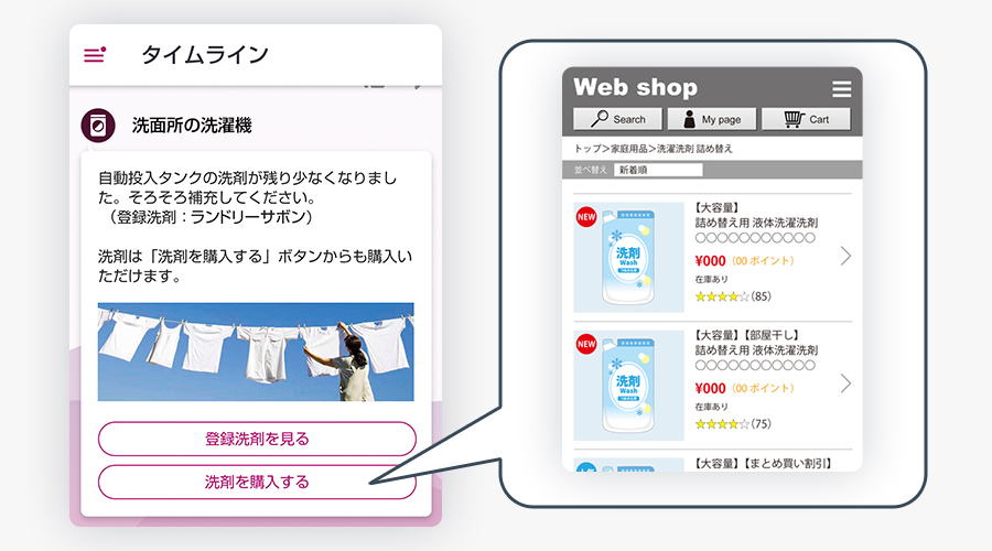 自動投入タンク内の残量と使用量を検知し、洗剤や柔軟剤の残量が少なくなったら、洗濯機の音声やスマホアプリ「COCORO HOME」に通知。「COCORO HOME」アプリからECサイトへスムーズに接続できるので、必要に応じてすぐに購入可能です。