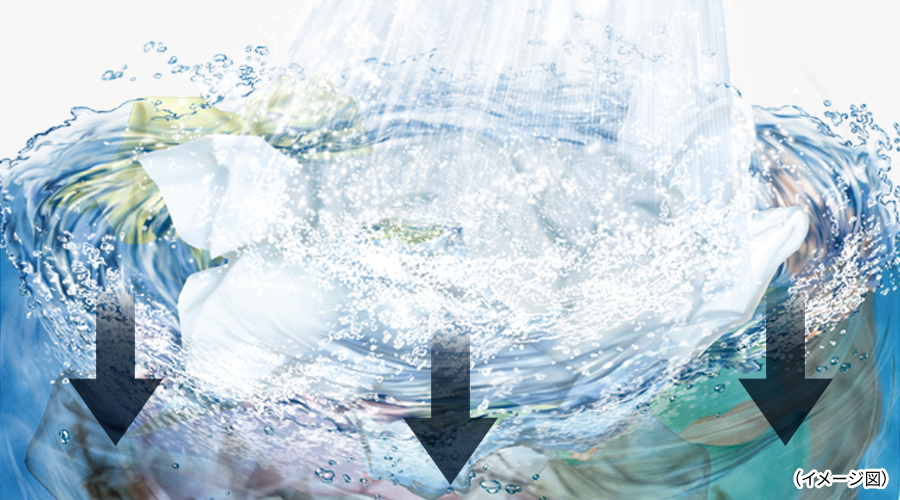 ❶【高濃度の洗剤液で洗う】洗濯物に対して適量の洗剤を投入すると、それを少ない水でしっかり溶かし、高濃度の洗剤液を作ります。洗剤の濃度が高い状態からお洗濯がスタートすることで、繊維の奧の汚れまでしっかりと分解します。