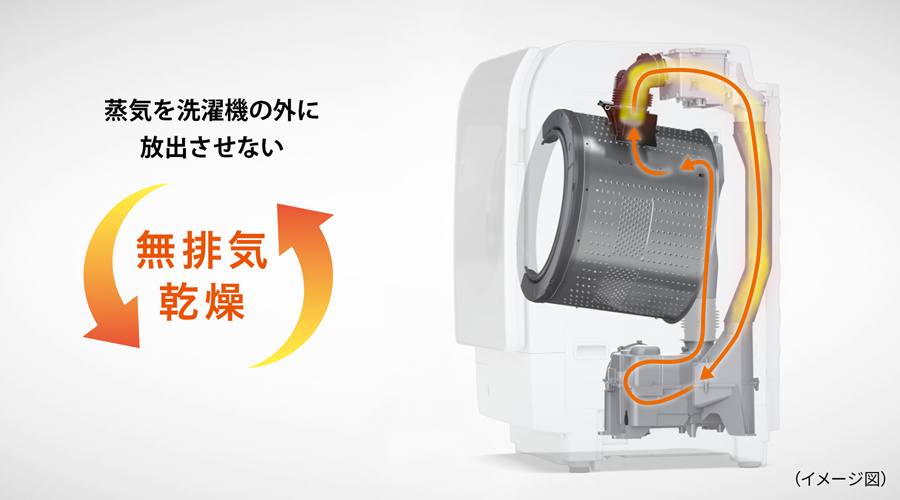蒸気を洗濯機の外に放出せず循環させることで、熱エネルギーの無駄を抑制。これにより、周囲が湿気で蒸し暑くなりにくく、サニタリー空間が快適です。