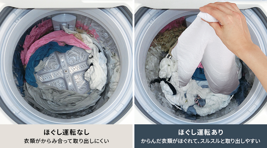 脱水の最後にパルセーターを動かして、洗濯物のからみをほぐします。洗濯物がより取り出しやすくなります※。