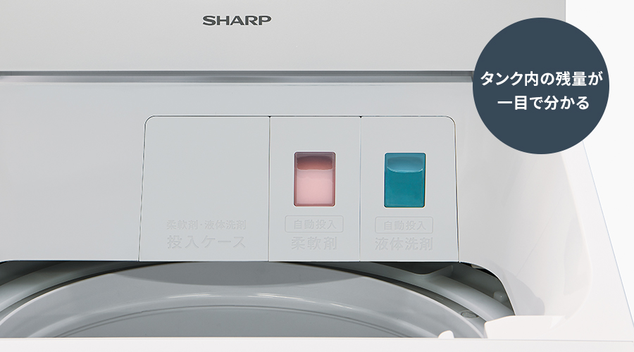 1枚目:洗濯機内部に設計された自動投入タンクの画像、2枚目:液体洗剤と柔軟剤の残量が確認できるタンク窓の画像
