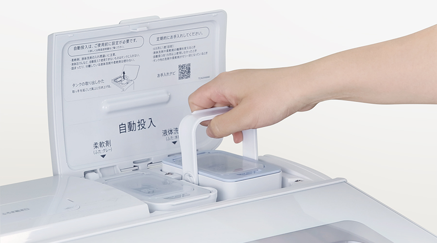 毎回洗剤を計って投入する必要がなく、手が汚れません。また、洗剤の適量が自動投入されるから経済的。洗剤・柔軟剤の置き場にも困りません。