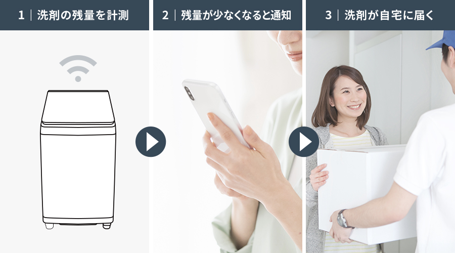 洗剤や柔軟剤の残量と使用量を計測し、少なくなったら洗濯機の音声やスマホアプリにお知らせ。「COCORO HOME」アプリからオンライン購入することもできるので、洗剤の買い忘れが防げます。