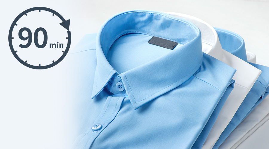 化繊混紡のYシャツ4枚程度なら、わずか90分で洗濯~乾燥できます。(化繊混紡の衣類1kg 以下)