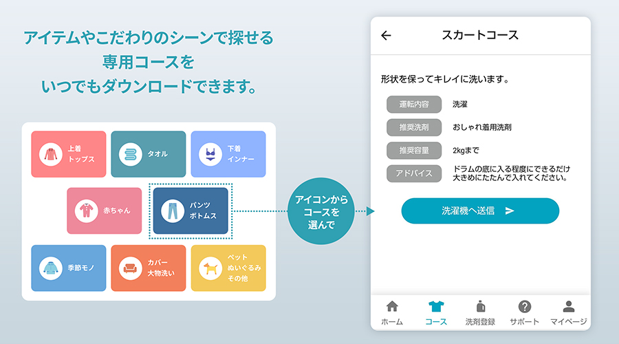 洗いかたナビで、洗濯物の種類やこだわりの洗い方に合った専用コースをダウンロードし、より満足のいく仕上がりに。「ダウンジャケットコース」「部屋干しコース」など全60以上のコースがダウンロードでき、今後も新しいコースが増えていきます。